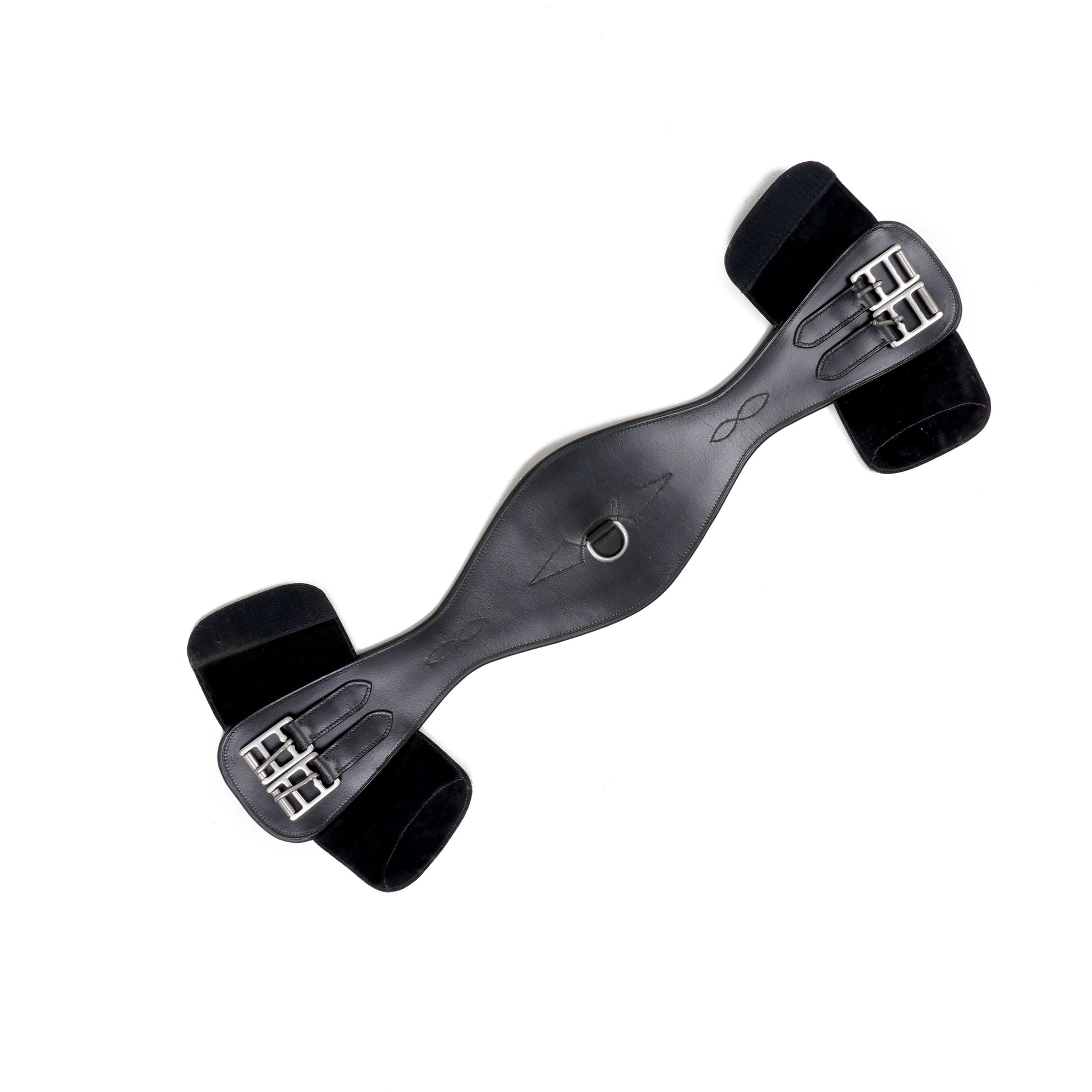 All New SIE Leather soft black leather dressage girth. Padded beneath wih soft leather. High Quality Roller Buckles with D ring at center. Rust proof Hardware.