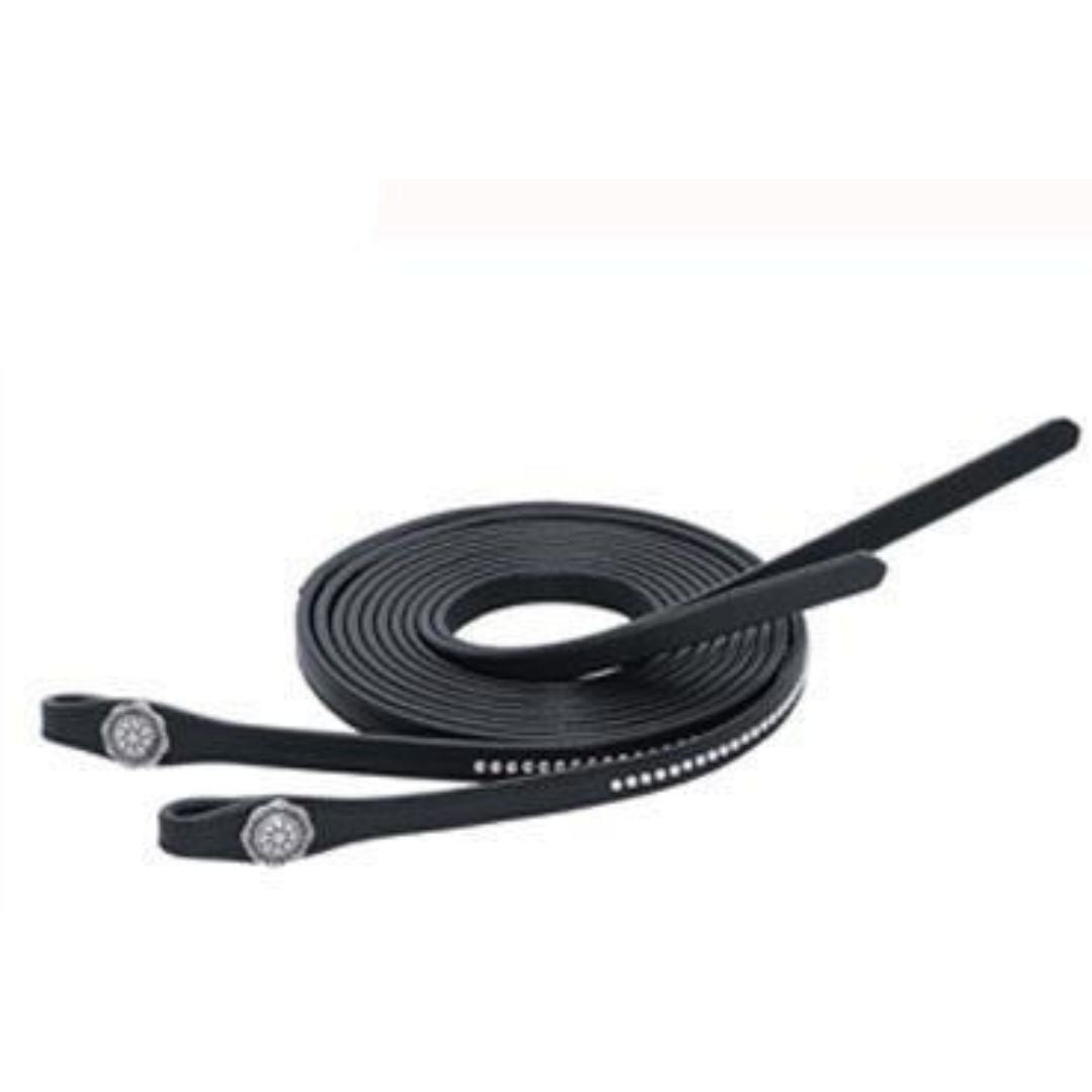 Doubled and stitched at the bit ends, they deliver enhanced strength and reliability, while the stainless steel floral conchos, nickel brass spots, and faceted black acrylic stones create a standout look suitable for both everyday riding and show use.