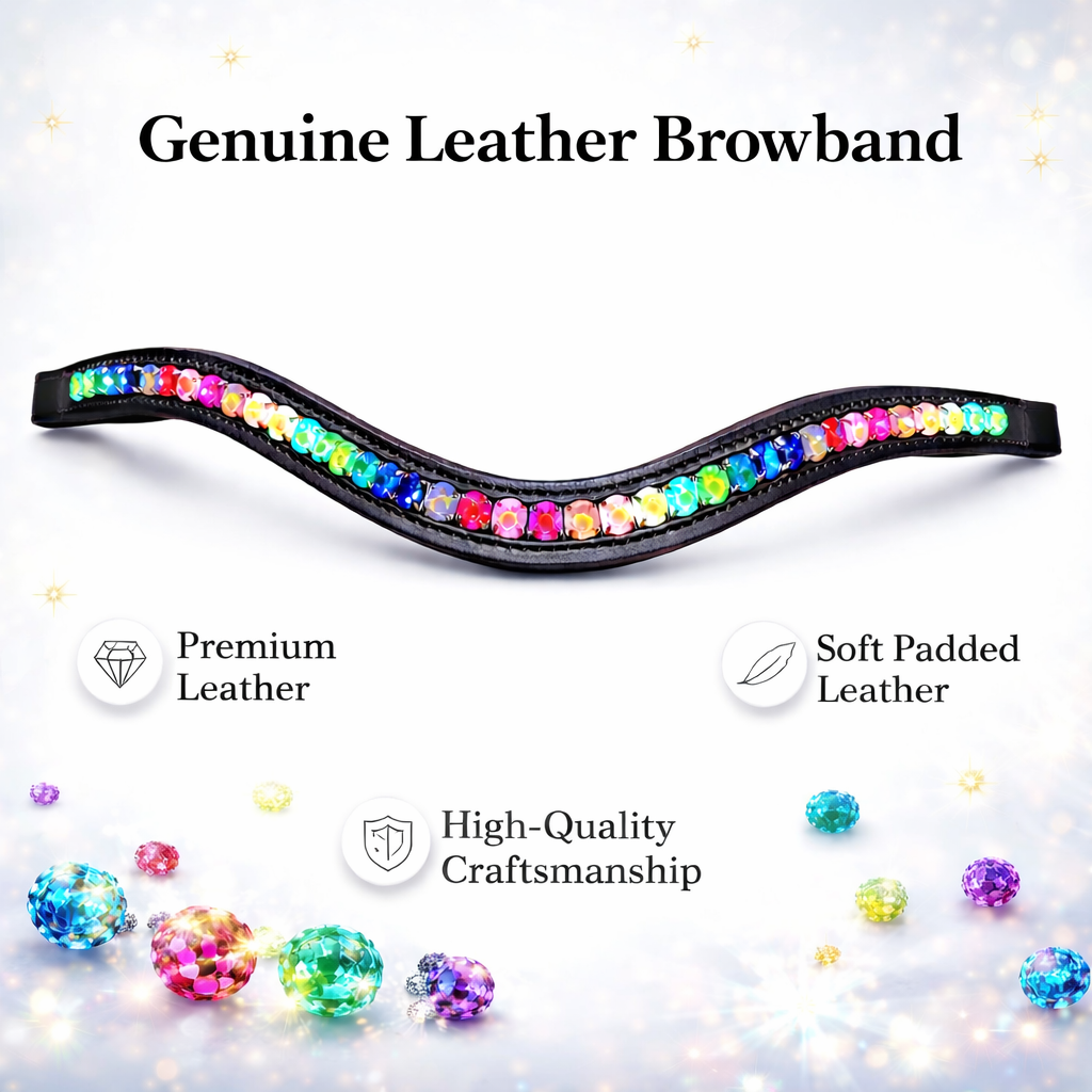 SIE Genuine Leather Horse Rainbow Crystal Browband with Multi-Color Rhinestones