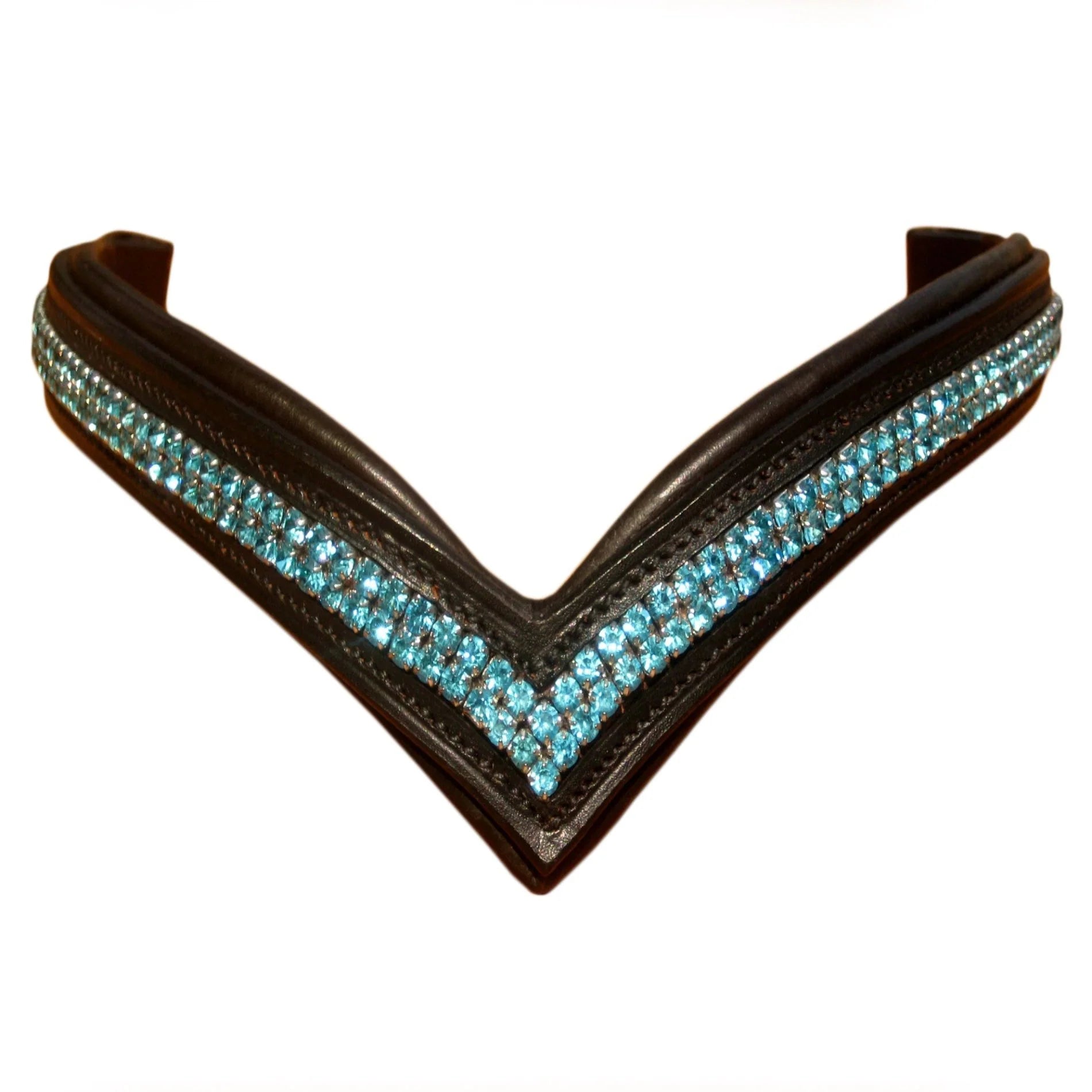 Handcrafted from premium leather, it offers both durability and comfort. The two rows of vibrant turquoise crystals are carefully set to create a radiant sparkle that stands out in training sessions, competitions, or special events. The smooth leather finish ensures a comfortable fit without compromising on style.