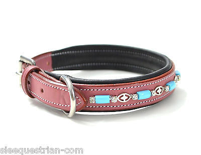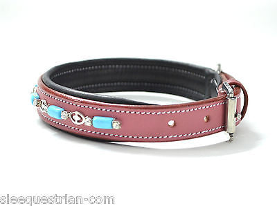 Turquoise Beads Pink Leather Padded Dog Collar USA Leather